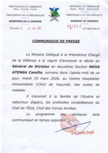 C’est avec tristesse et désolation que le ministre délégué à la présidence chargé de la défense Joseph Beti Assomo a rendu public ce 10 mars 2026 la nouvelle du décès du général de division admis en seconde session Camille Nkoa Atenga au CHU de Yaoundé de suite de maladie.
